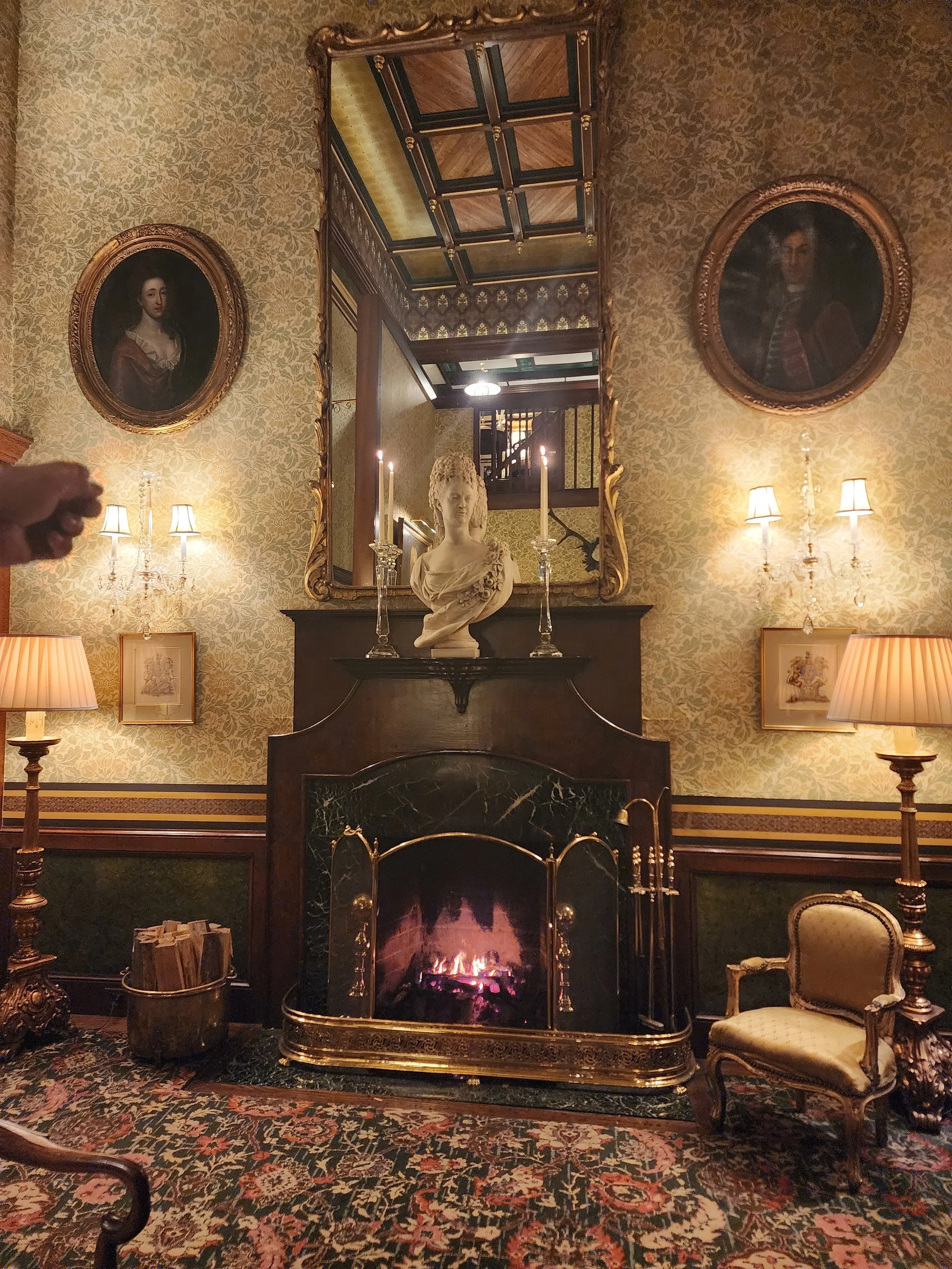 After dinner, we took time to really explore this historic property. Like SingleThread, The Inn at Little Washington is both a restaurant and lodging establishment, but the similarities end there. The ambiance throughout spoke to the property's deep history - from the ornate damask-covered walls and detailed coffered ceilings to the crackling fireplaces and period antiques. We wandered through various nooks and crannies, each space more charming than the last, with whimsical touches like hand-painted murals and blue-and-white Chinese pottery collections adding character to every corner. The attention to detail was remarkable, from the intricate parquet flooring to the carefully curated artwork and historical portraits adorning the walls.